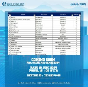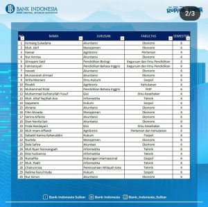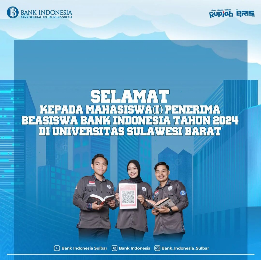 Pada hari Kamis 13 Juni 2024 telah diumumkan para penerima beasiswa Bank Indonesia tahun 2024. Terdapat 50 Mahasiswa Universitas Sulawesi Barat yang berhasil terpilih menjadi penerima beasiswa Bank Indonesia dan 8 diantaranya adalah mahasiswa Fakultas Teknik, nama penerima sebagai berikut