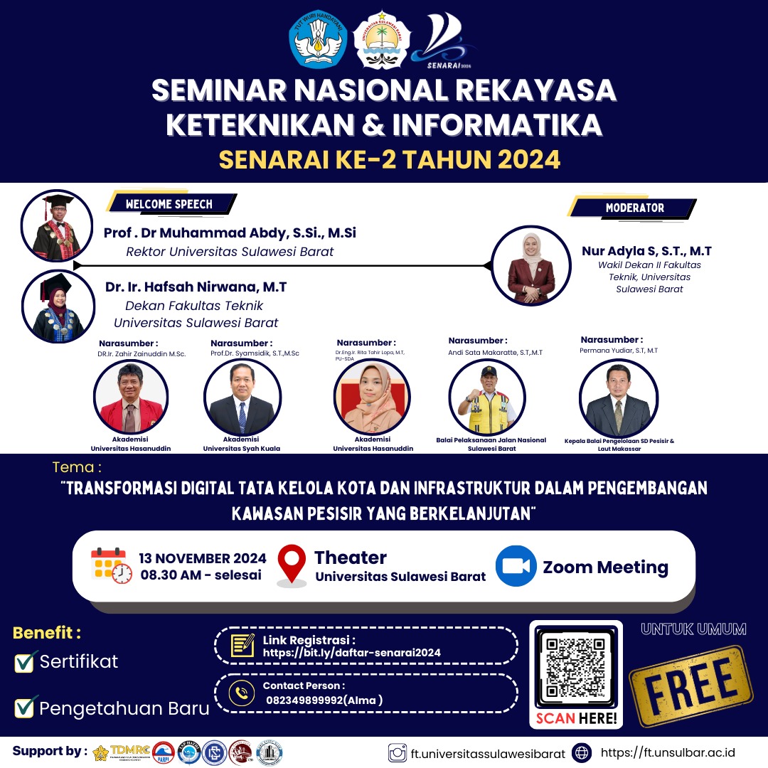 Ayo Ikuti Seminar Nasional Rekayasa Keteknikan & Informatika (SENARAI) ke-2 tahun 2024, memperingati Dies Natalis Universitas Sulawesi Barat ke-16. Tema tahun ini: